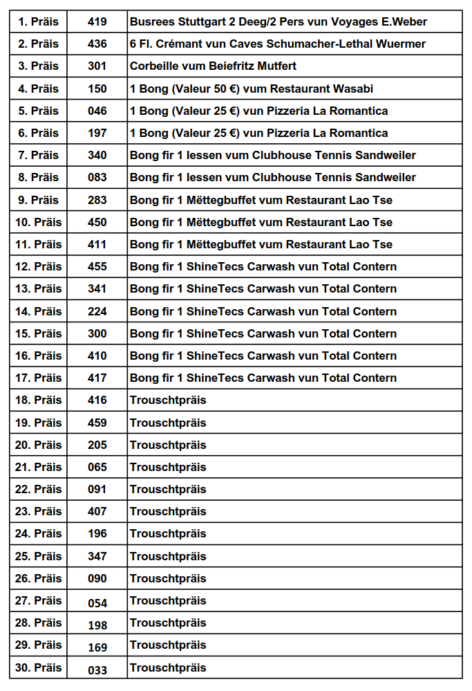 Gewënner Ball Race 2019 D’Gewënner sollen sech um Nummer 621/168 809 (KIHM Arsène – President) mellen. Mir gratuléieren dem Gewënner vun der 1. Platz an wënschen eng schéi Rees: An och den 2. Plazéierten soll sech seng Fläschen gutt schmaachen loossen: